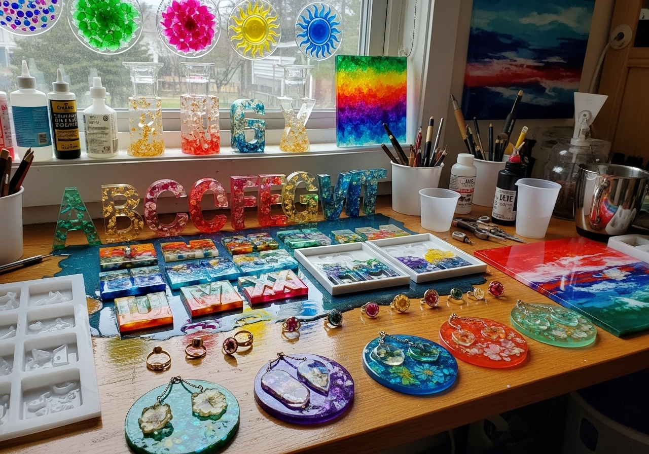 Mit Epoxidharz lassen sich Schmuckstücke, Untersetzer, Buchstaben-Aufsteller, Kerzenhalter, Sonnenfänger sowie Möbelbeschichtungen und Resin-Kunstwerke kreativ gestalten.